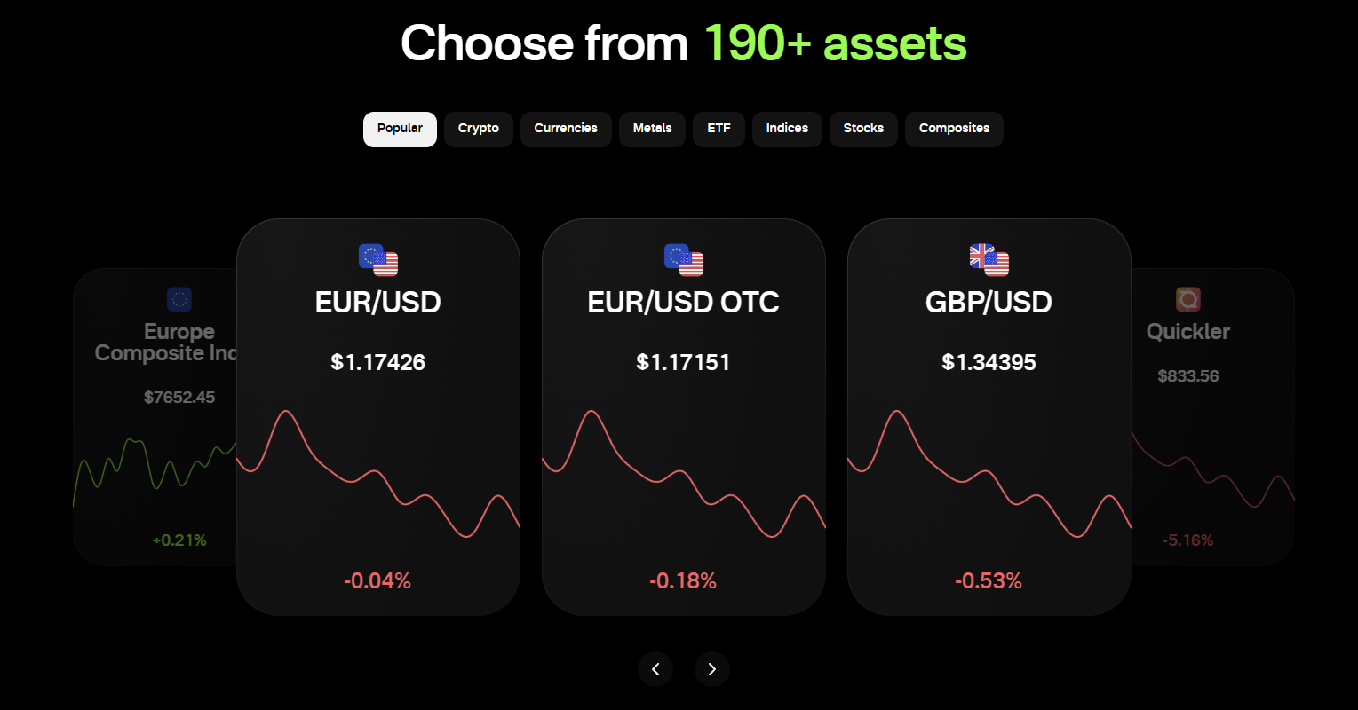 OlympTrade menawarkan lebih dari 190 aset dengan kontrak perdagangan waktu tetap, pilihan yang kuat jika dibandingkan dengan lebih dari 150 aset milik IQCent dan lebih dari 100 aset milik Pocket Option.